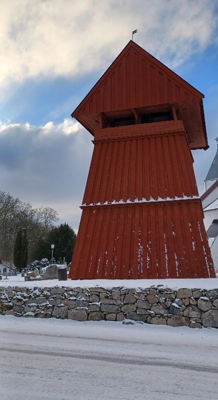Nach der Legende (laut meiner 2016 verstorbenen schwedischen Tante) ist der Holzturm umgestürzt und hat dabei einen Mann erschlagen, weshalb er separat gesetzt wurde. Die Holzkirche wurde irgendwann, evtl. nach einem Brand, durch eine Steinkirche plus Turm ersetzt, der Holzturm blieb stehen.